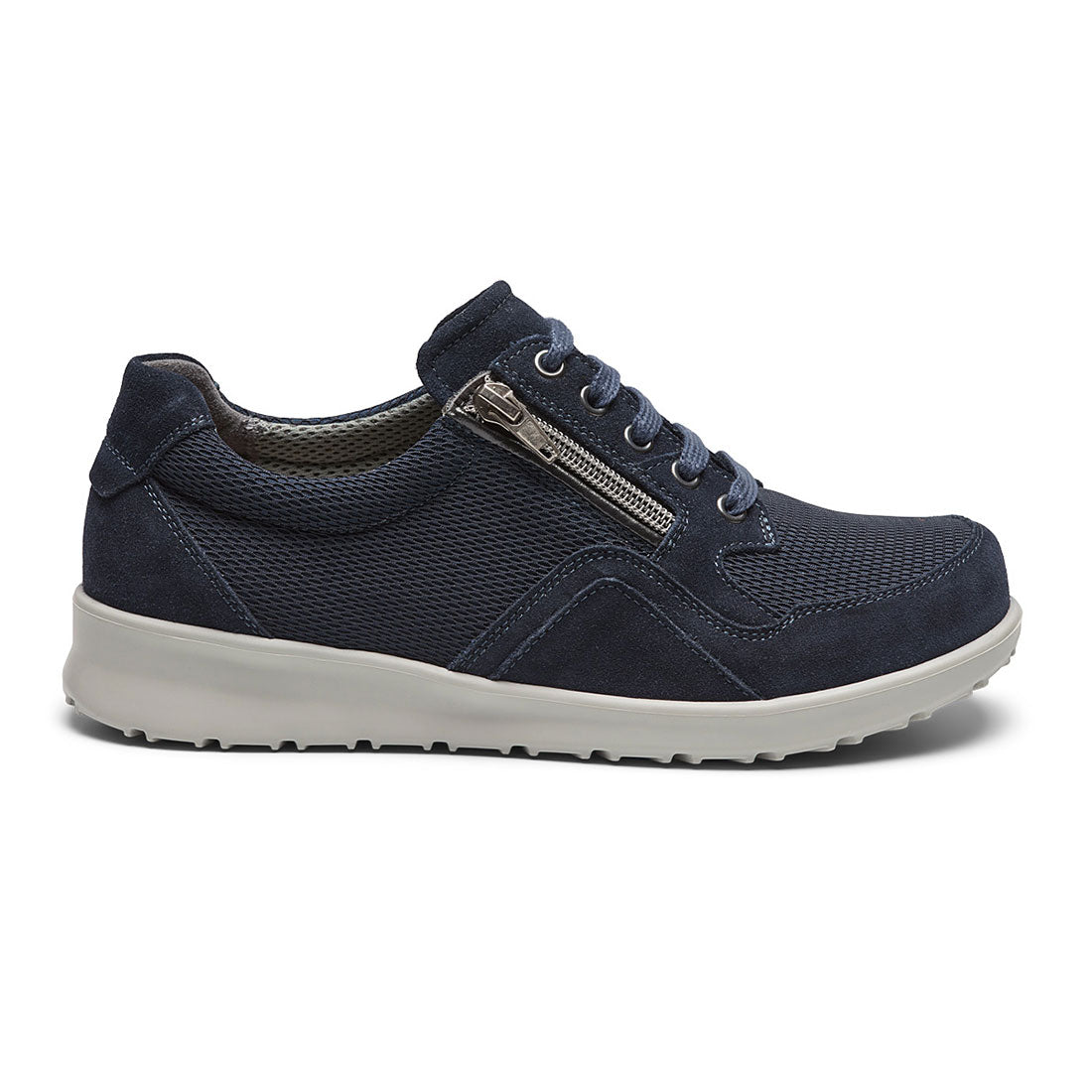 New Feet snøresko i blå nubuck med on steam mesh samt lynlås i siden. Skoen har en 6mm udtagelig og stødabsorberende indersål samt en mette sål som er en letvægtssål i gummi med fleksibel forfod og stabil hæl. Læst W Let gænge.