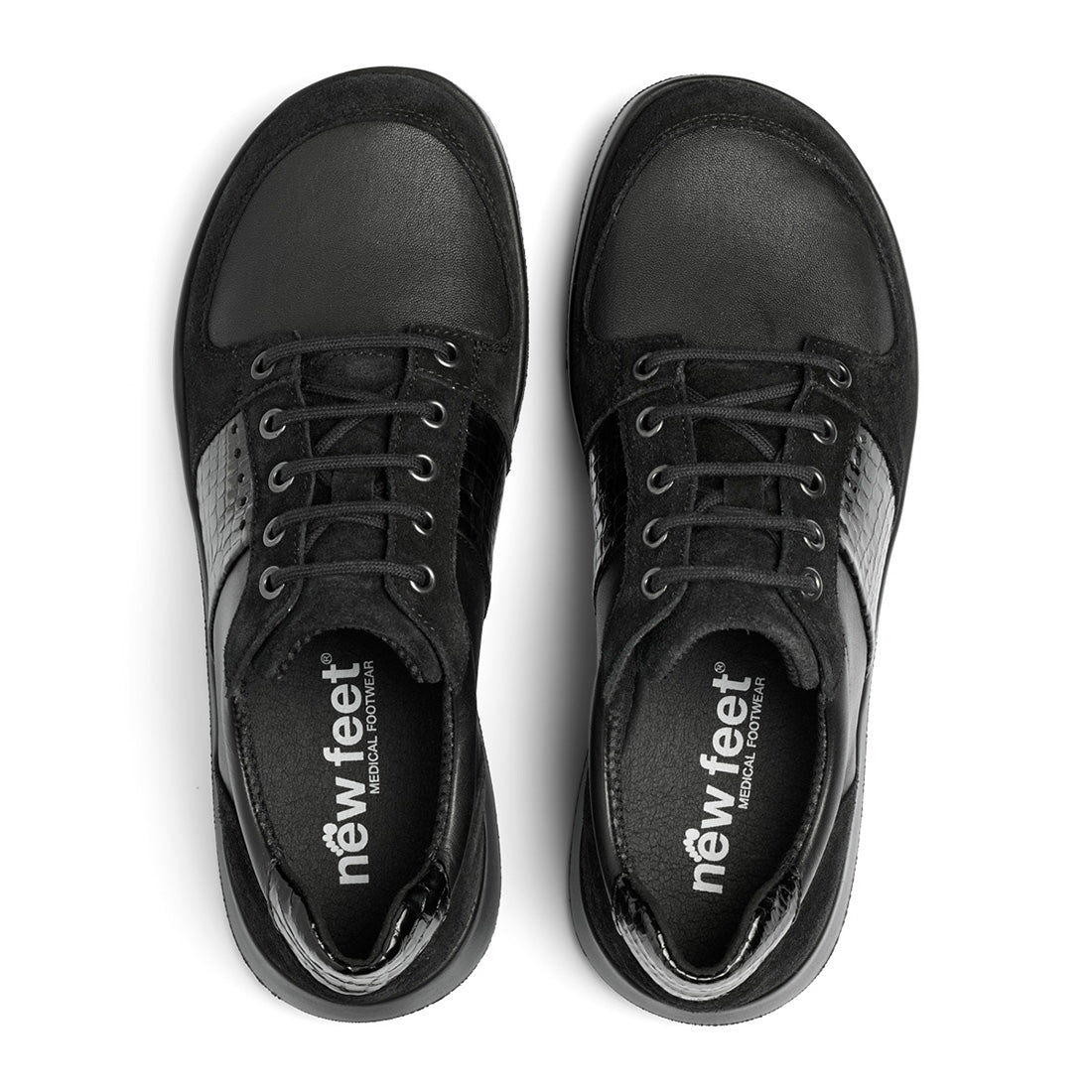 New Feet snøresko i sort præge nubuck og skind med tex membran. Skoen er med strecht over forfoden, har en 6mm udtagelig stødabsorberende indersål og en letvægtssål i gummi med fleksibel forfod og stabil hæl. Læst S Let gænge.