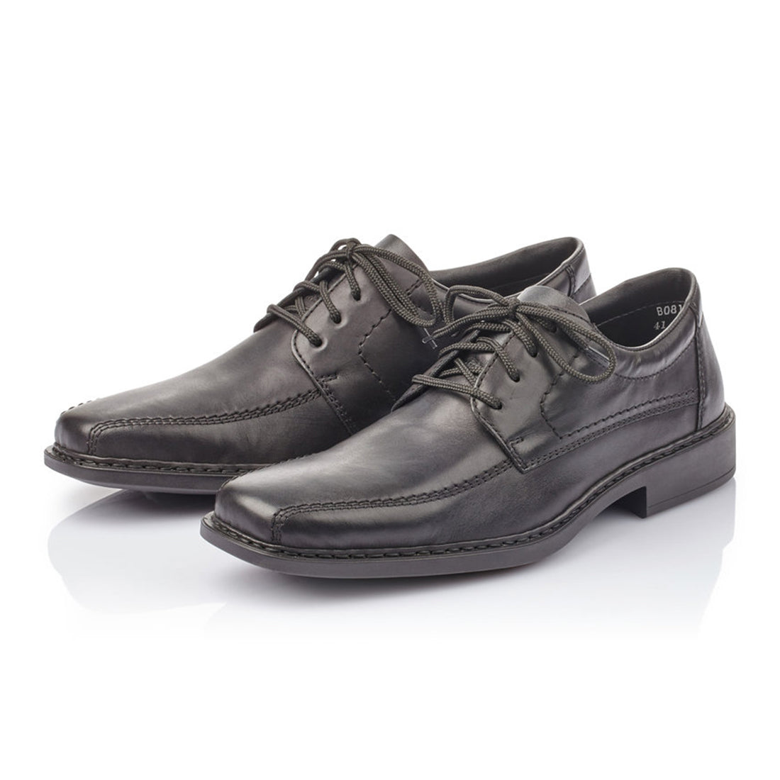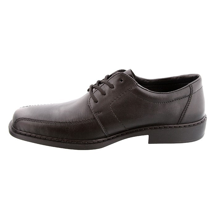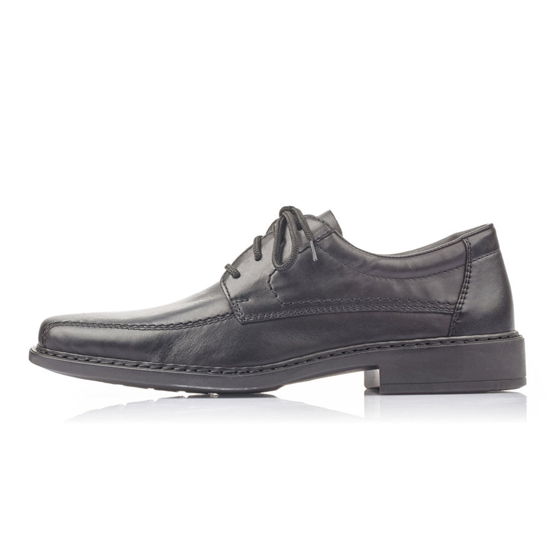 Rieker snøre sko i sort skind med flotte detaljer. Modellen har et tidsløst designe og en god pasform med ekstra vidde samt blød antistress læder indersål. Sort gummi sål.