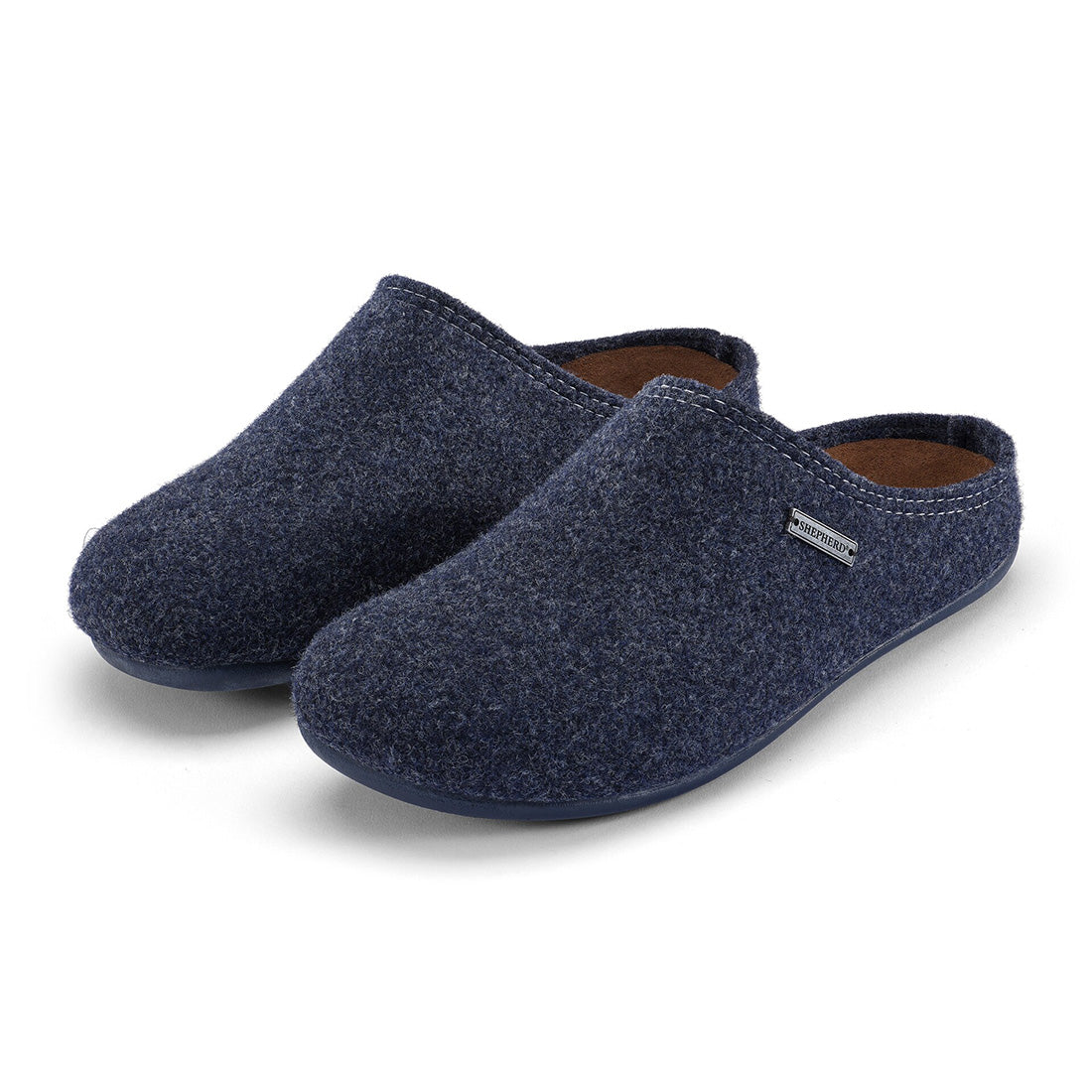 Shepherd Jon er en populær herretøffel i blåt filtuld, der varmer uden at blive for varm. Slip-in modellen er nem at bruge, og den udtagelige ruskindsindersål giver ekstra komfort. Slidstærk gummisål gør den velegnet både inde og ude.