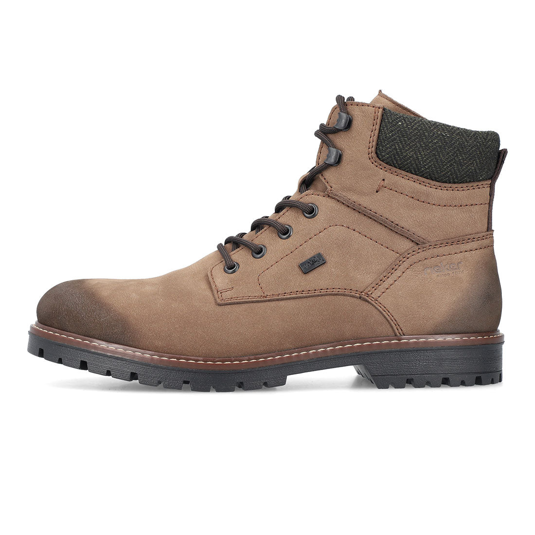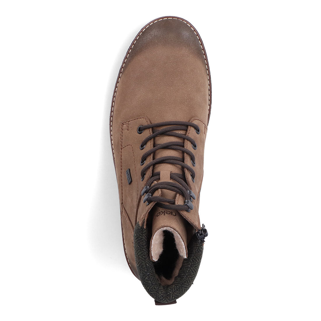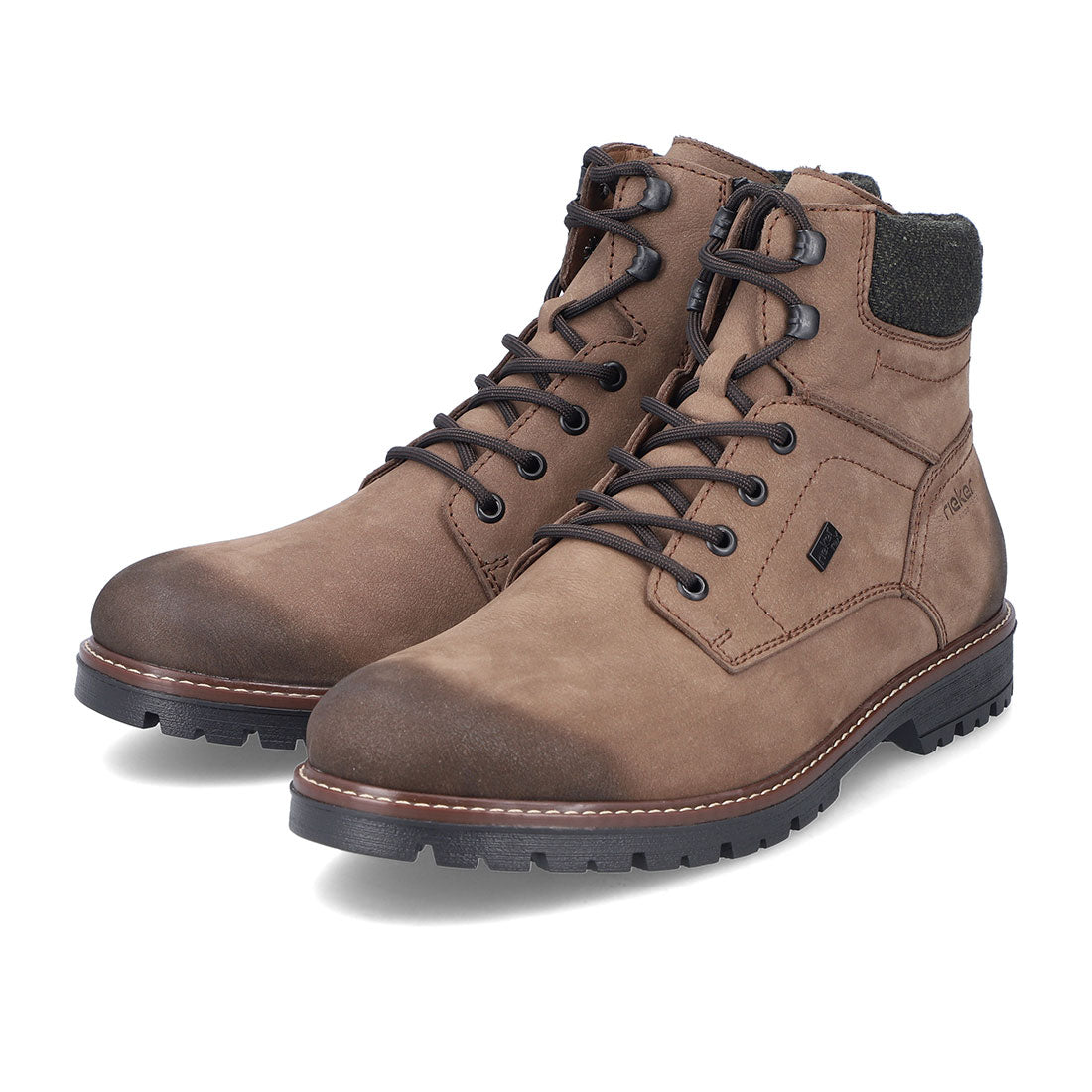 Smart kort herre støvle fra Rieker i brun nubuc med snøre og lynlås. Modellen har uldfoer og stødabsorberend sort profileret gummisål. Antistress indersåler, så den føles godt hele dagen. Støvlen har Riekertex, hvilket gør støvlen vandafvisende.