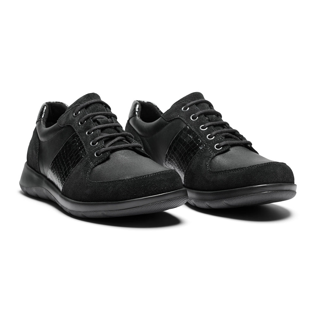 New Feet snøresko i sort præge nubuck og skind med tex membran. Skoen er med strecht over forfoden, har en 6mm udtagelig stødabsorberende indersål og en letvægtssål i gummi med fleksibel forfod og stabil hæl. Læst S Let gænge.