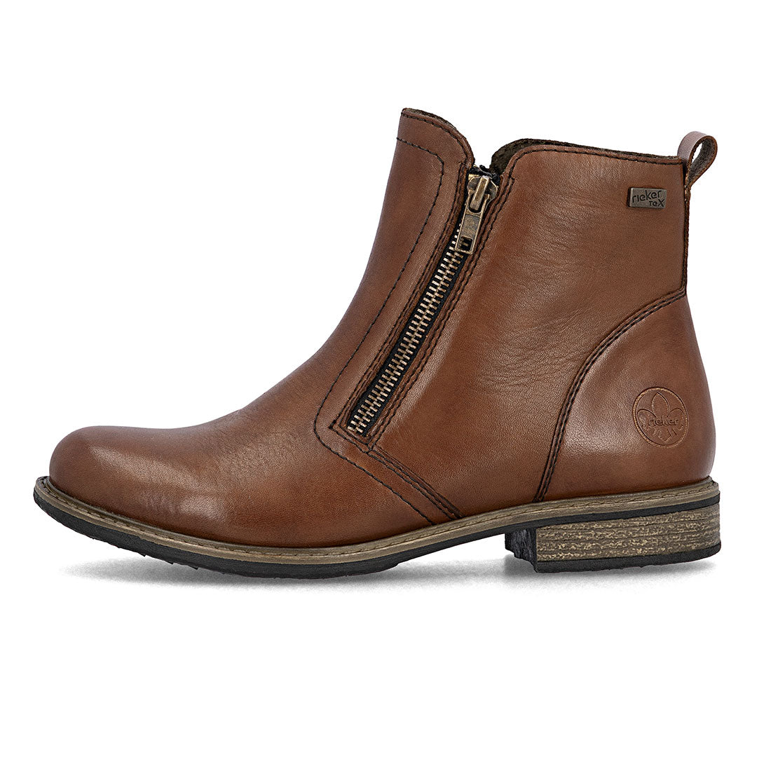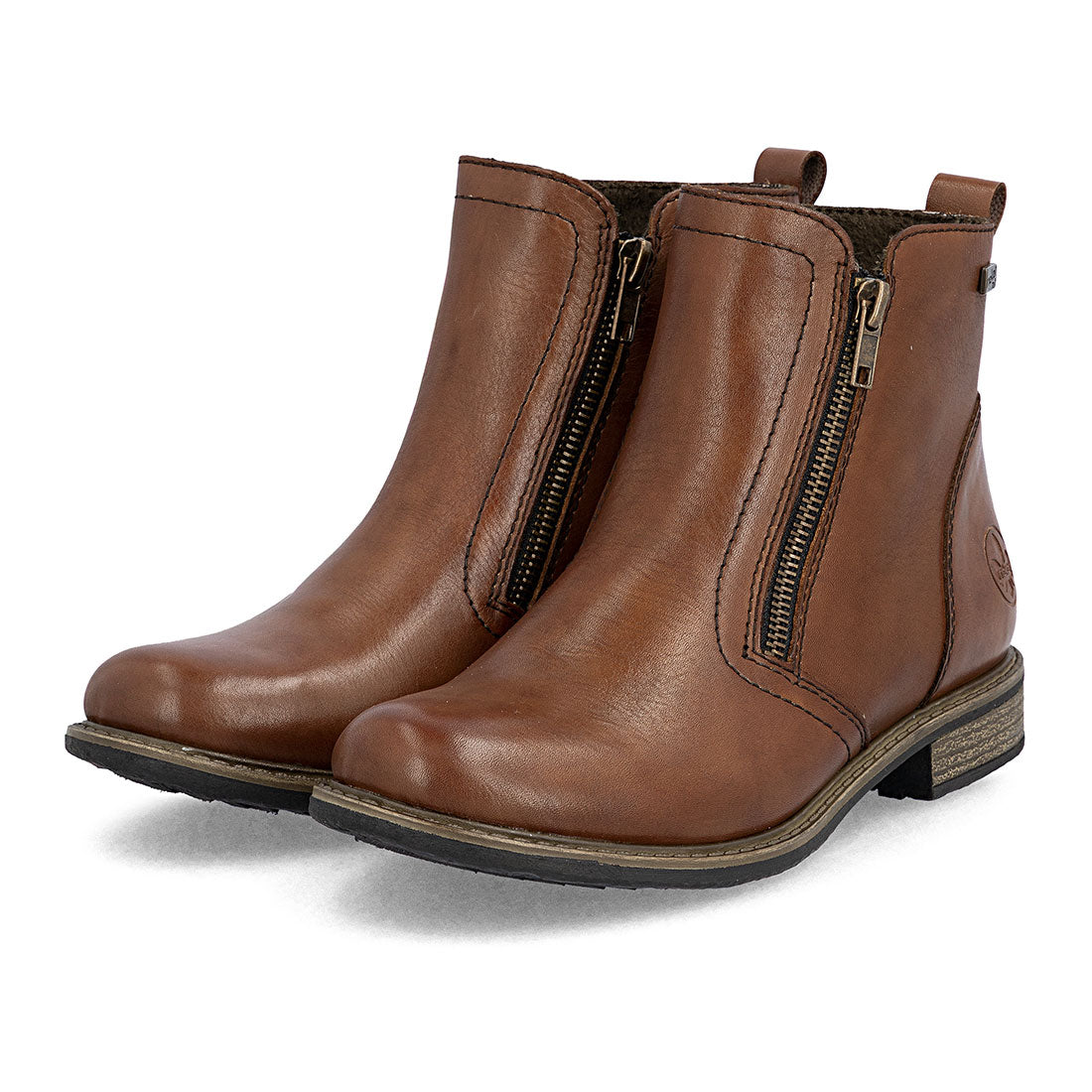 Rieker støvle til dame i brun. Lavet i blødt skind med 2 lynlåse for nem adgang. Let foring og blød, udtagelig sål i ekstra bredde H. Rieker Tex gør den vandafvisende. Hæl 2,5 cm. Skridsikker sål.