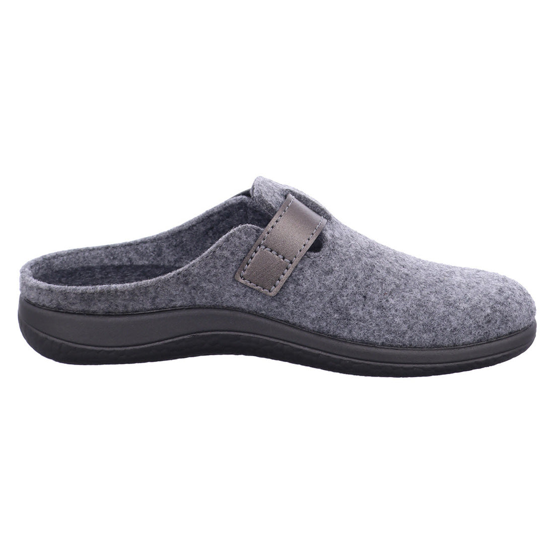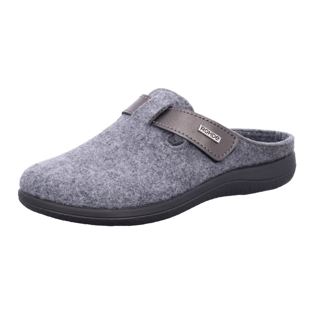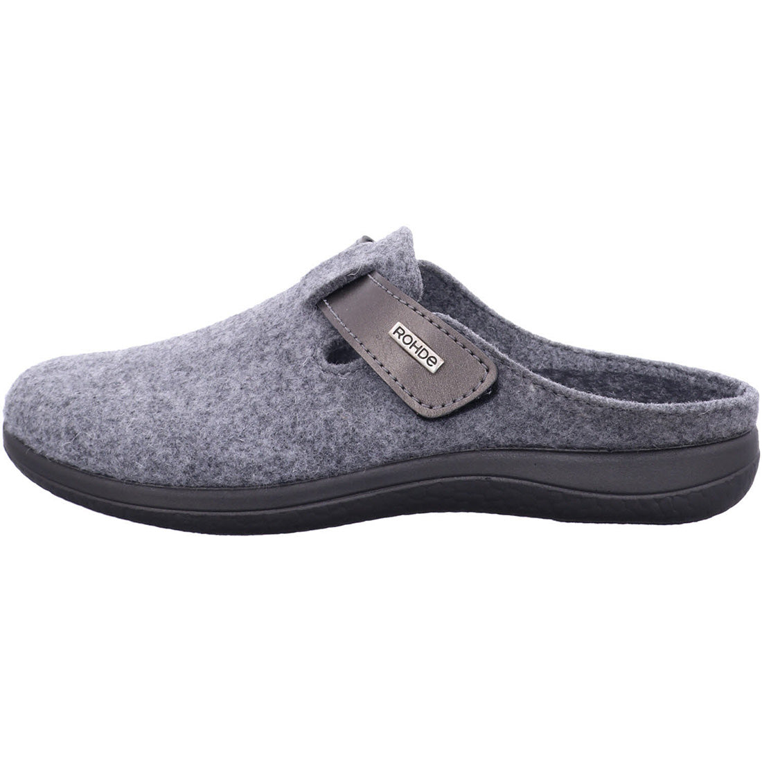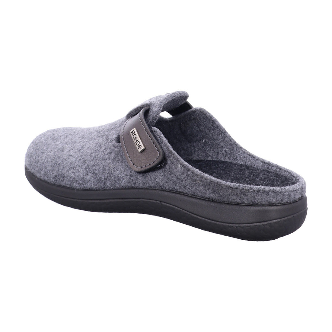 Rohde hjemmesko til damer i grå filt med smart velcrorem ved åbningen. Indvendigt foret med mørkegråt filt og udstyret med udtagelig indlægssål. Den sorte gummisål giver godt fodfæste. En praktisk og behagelig hjemmesko.